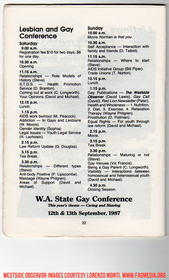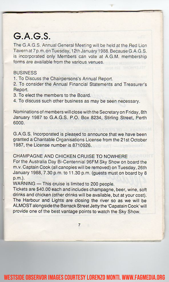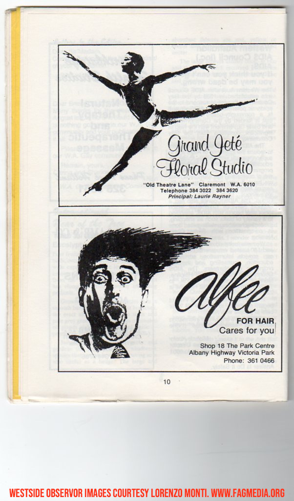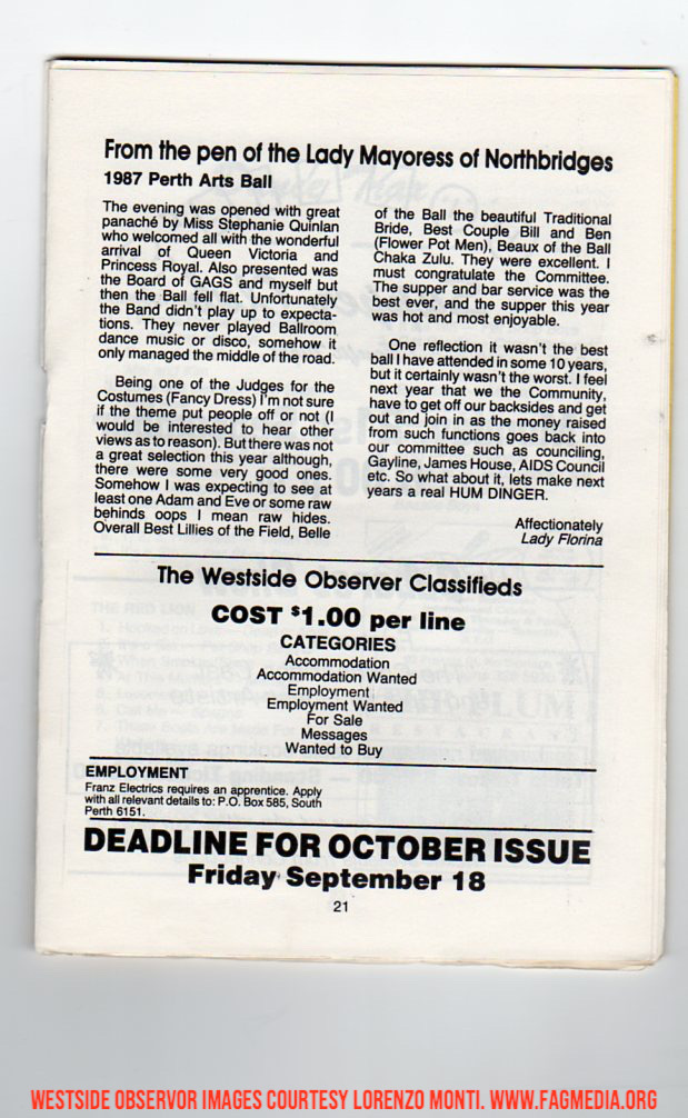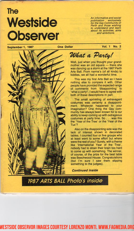These images of the Westside Observer are courtesy of the late Lorenzo Monti. Fagmedia's Memorial to Lorenzo, who was an Icon of the Perth Community can be seen here: https://fagmedia.online/photomedia-archive/vale-lorenzo-monti