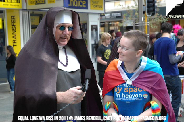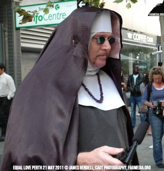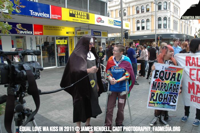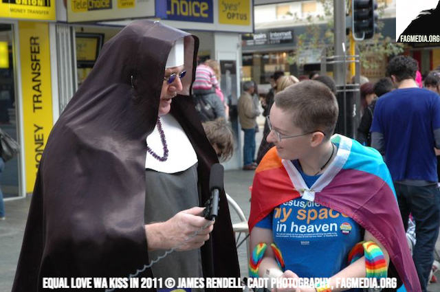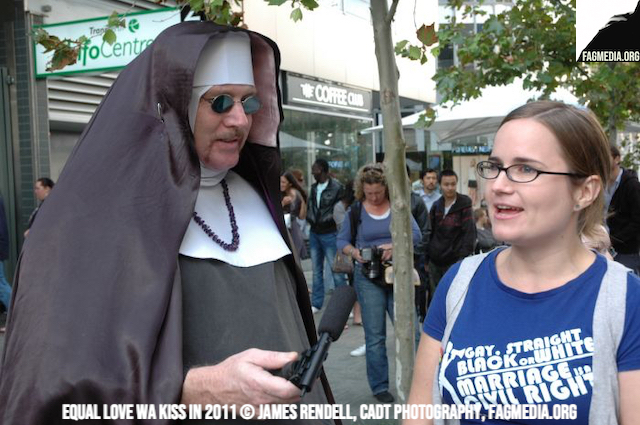 Above: This archive video features the Sister's interviews with People and the Speakers at the Equal Love Kiss In on 21 May 2011. The video begins with a reading of the Perth Voice article about the event.