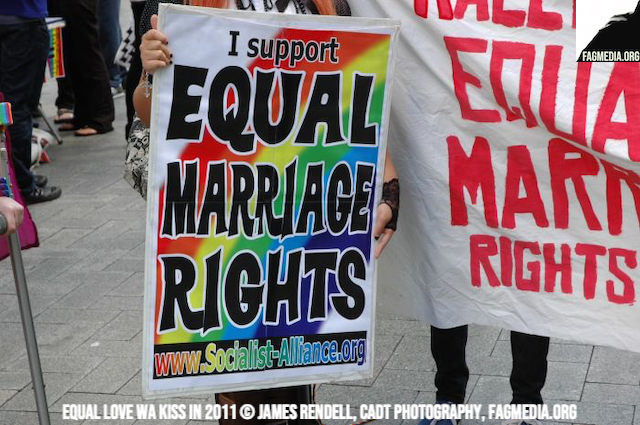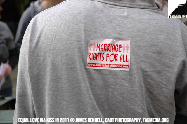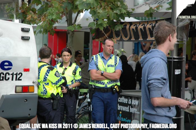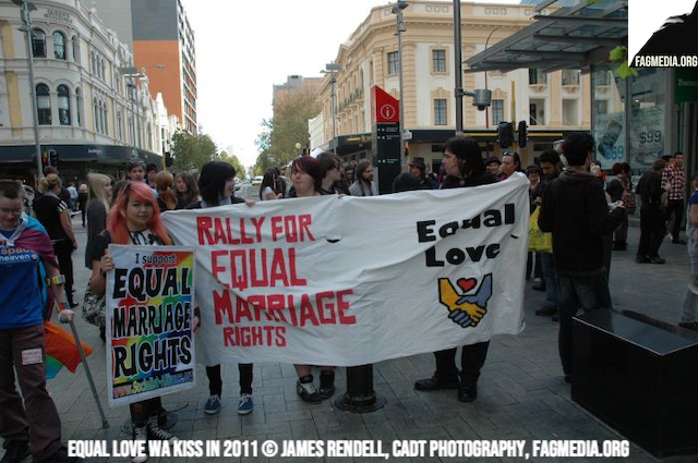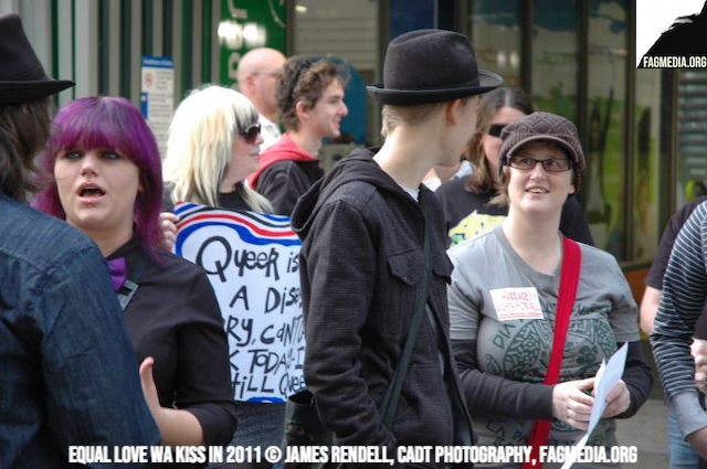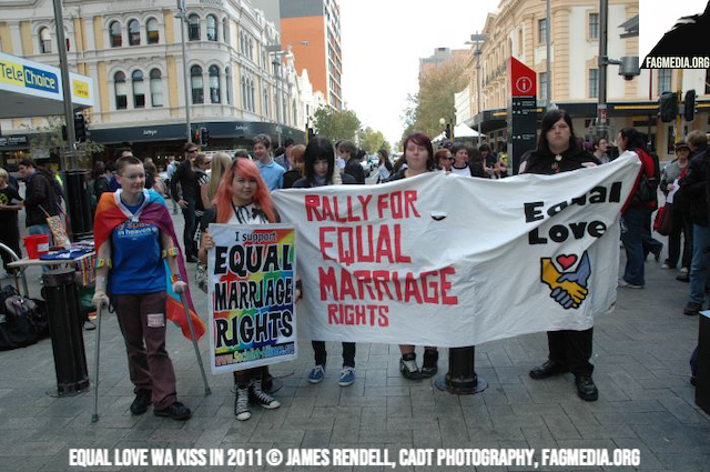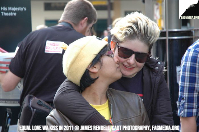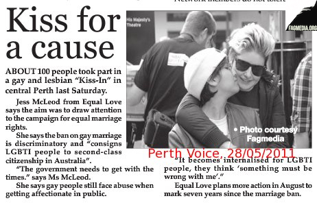 Above: This is archive footage that includes a reading of an article in the Perth Voice Newspaper along with illustrative footage from the Equal Love WA Kiss In on 21 May 2011.