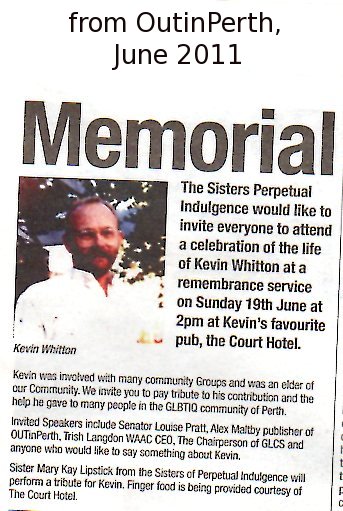 The Perth Sisters of Perpetual Indulgence (OPI-Perth) organised a very lovely and moving Memorial for Kevin which was very well attended by people who knew and loved Kevin and the galleries below contain photographs from this service.