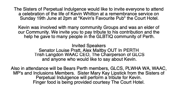 Kevin was a stalwart of the LGBTQ Community in Perth who was renowned for his volunteer work and efforts to end the toxic bitching and backbiting that plagued many relationships in the community.