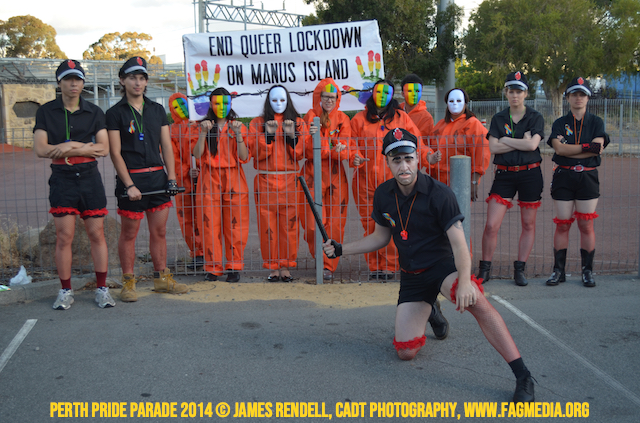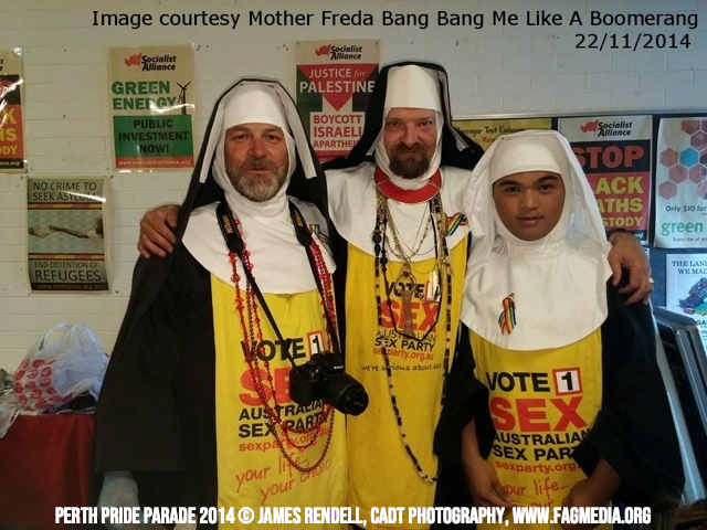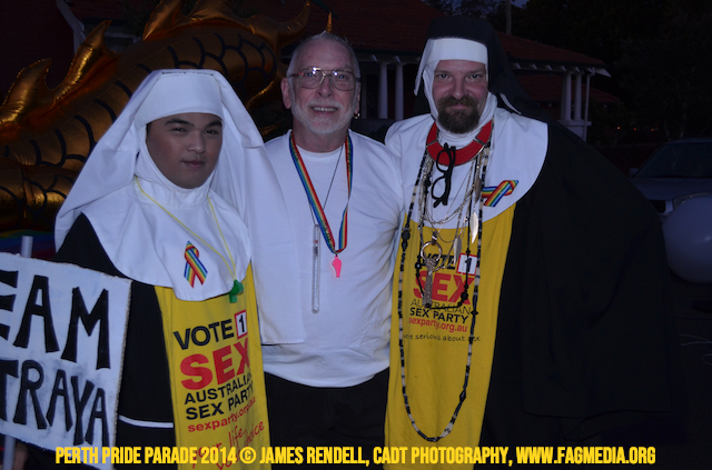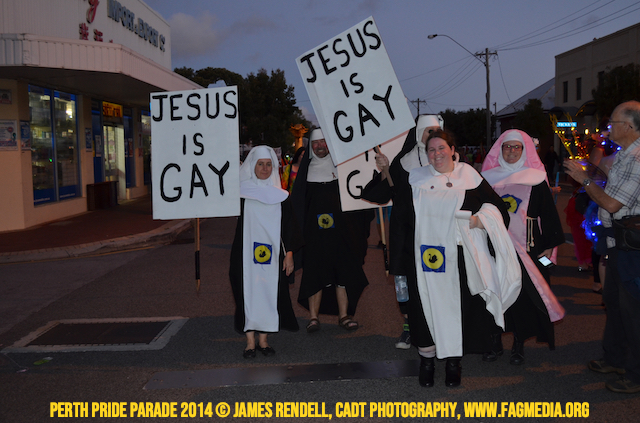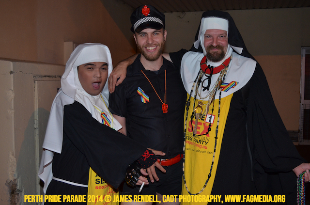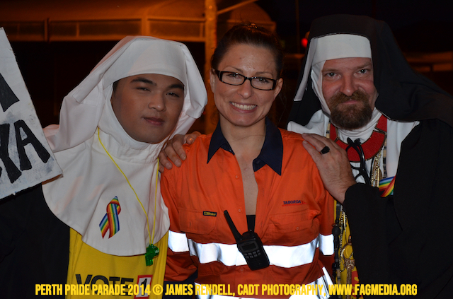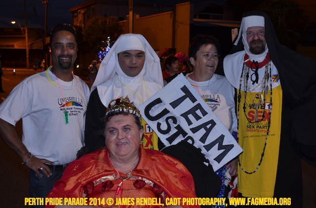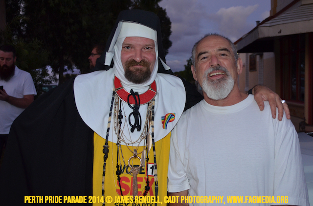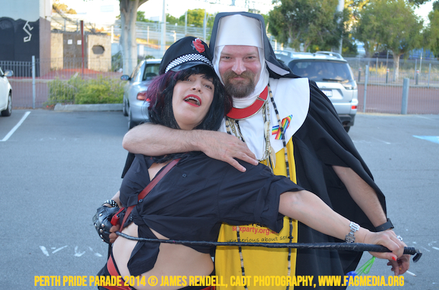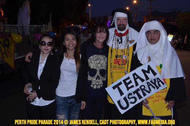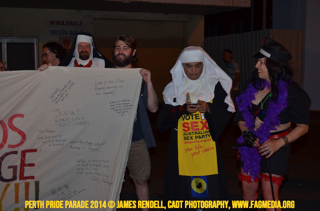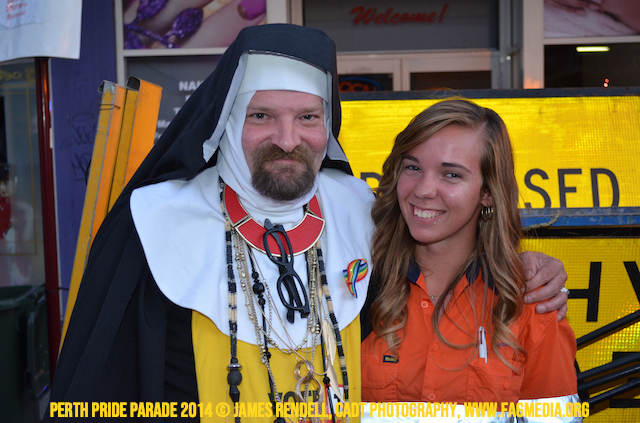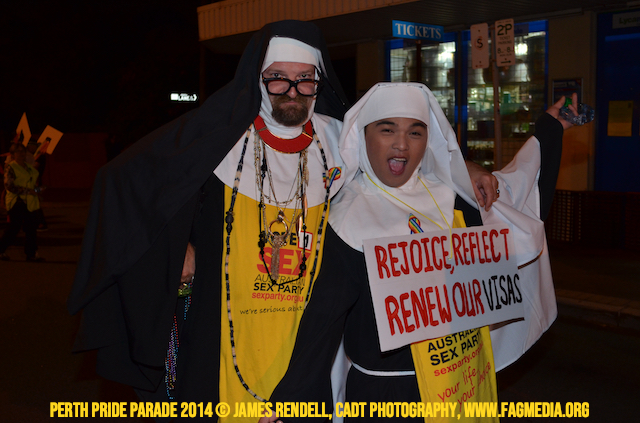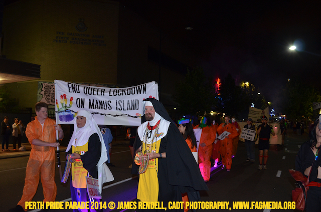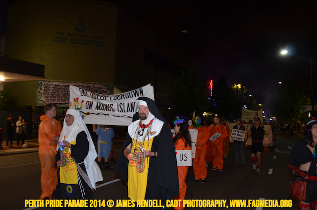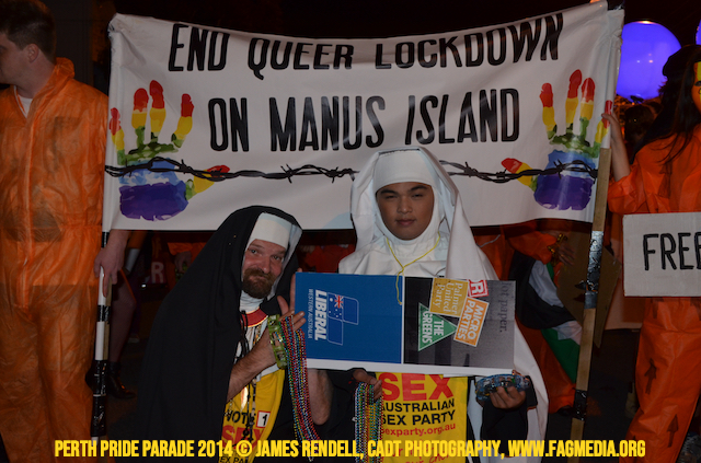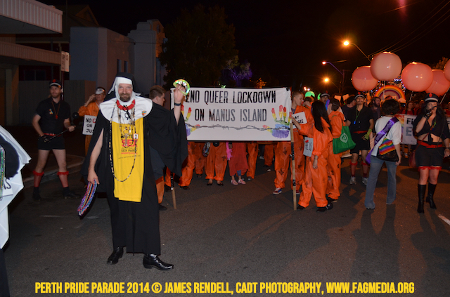 The Perth Sisters of the Abbey of the Black Swan marched in the Parade with the End Queer Lockdown on Manus Island float which was run in conjunction with the good people of Equal Love WA.