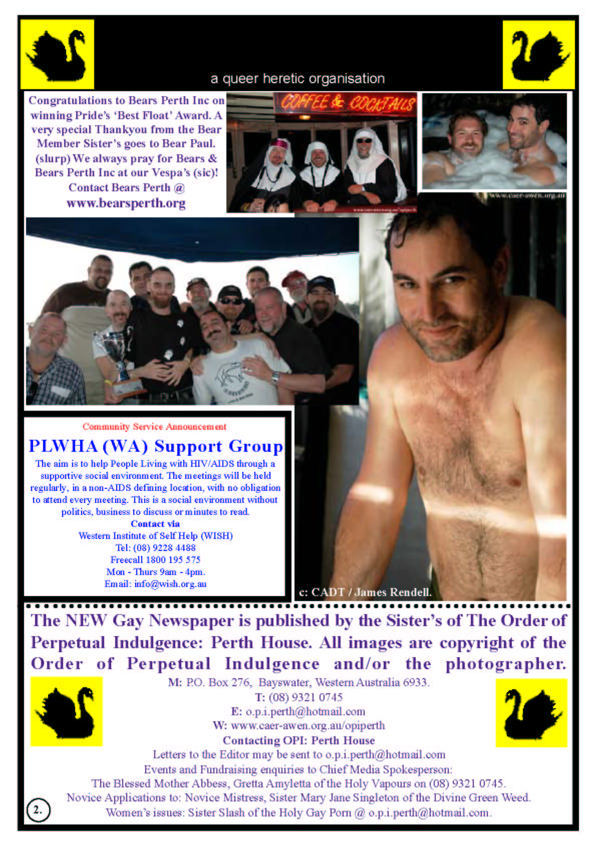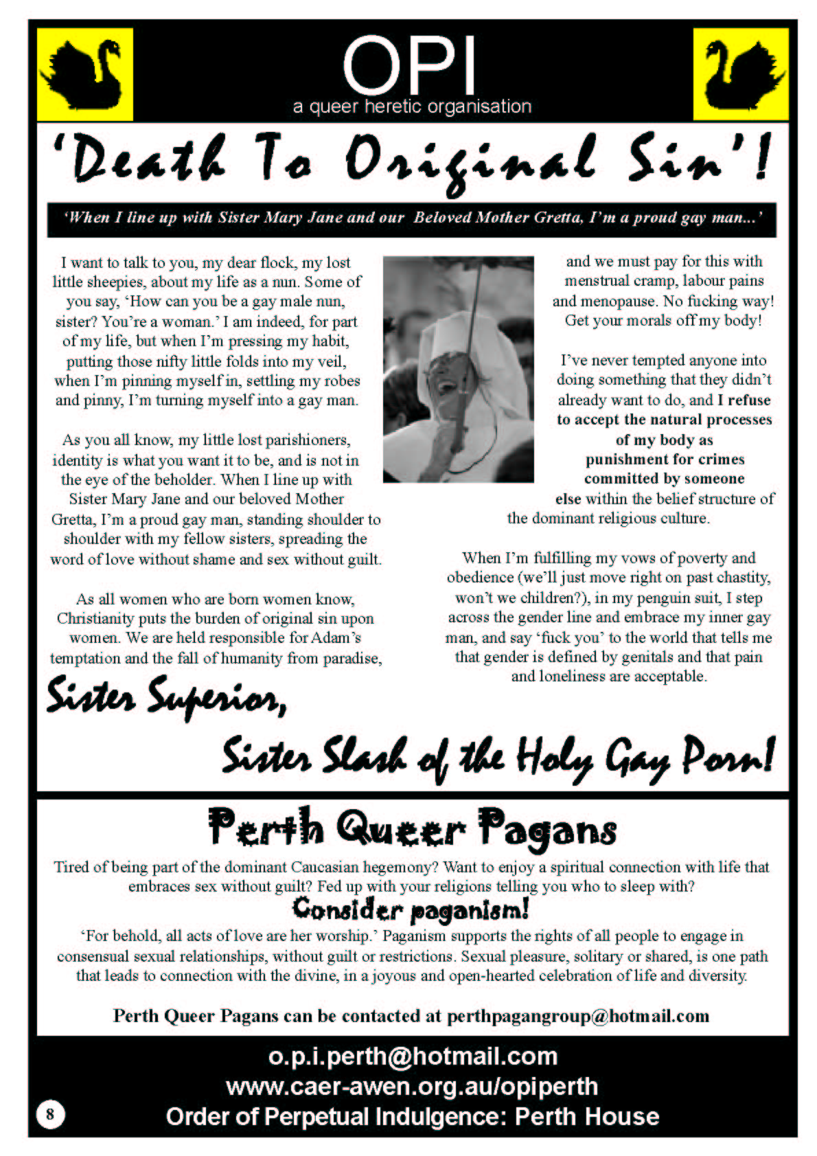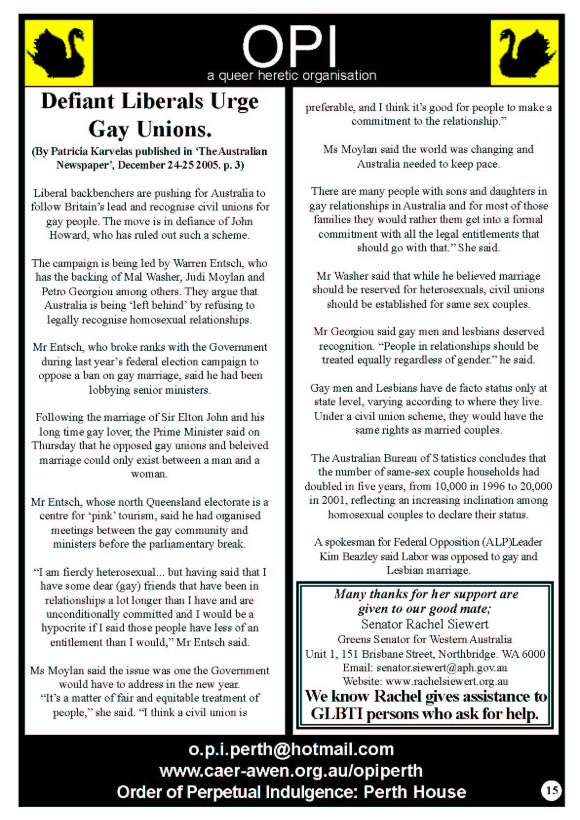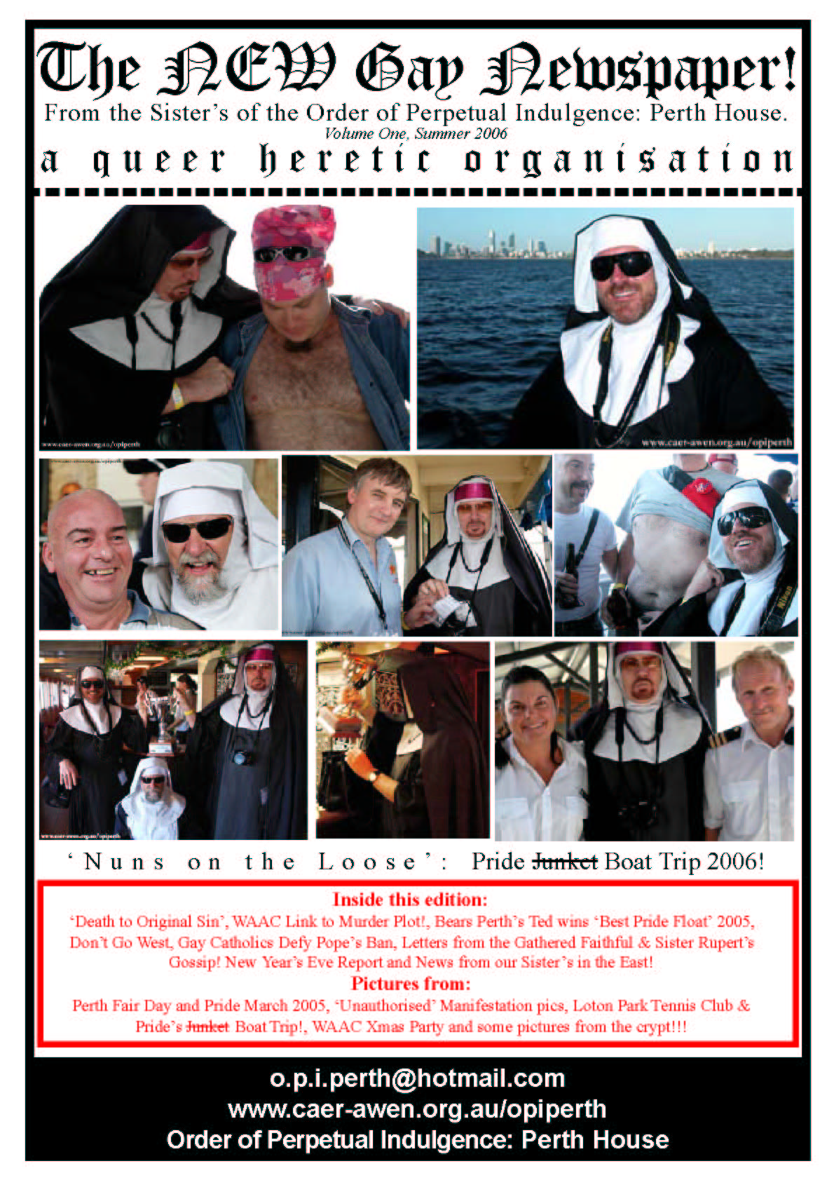 In 2006 the Order of Perpetual Indulgence published the New Gay Newspaper. One of the articles by James Rendell 1+1 does not Equal 0 spoke out in support of Equal Marriage Rights and this was the start of the journey towards the first Marriage Equality Campaign in Australia.