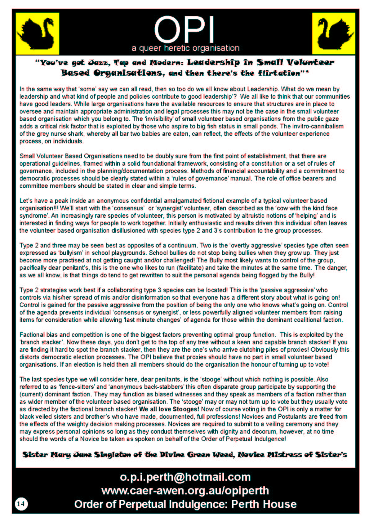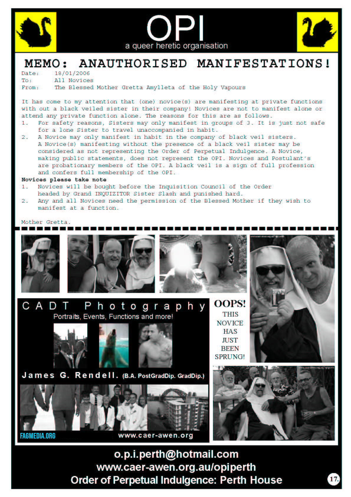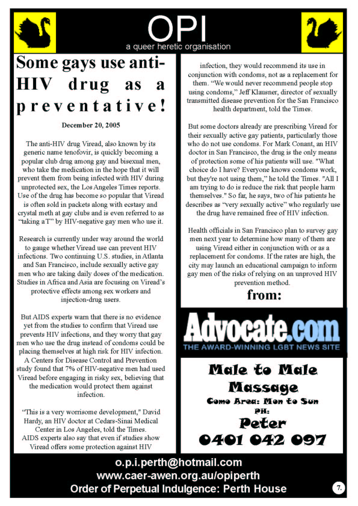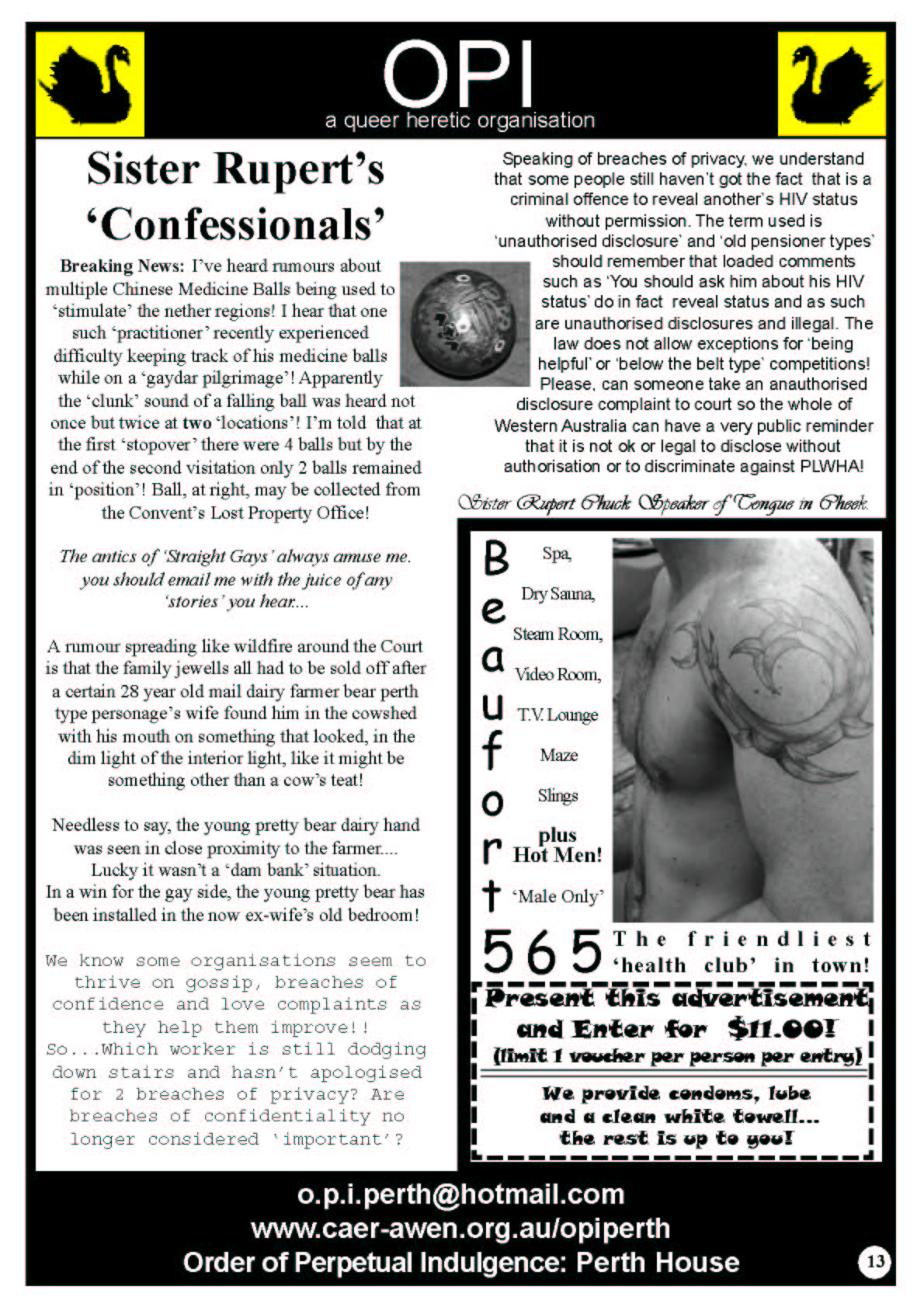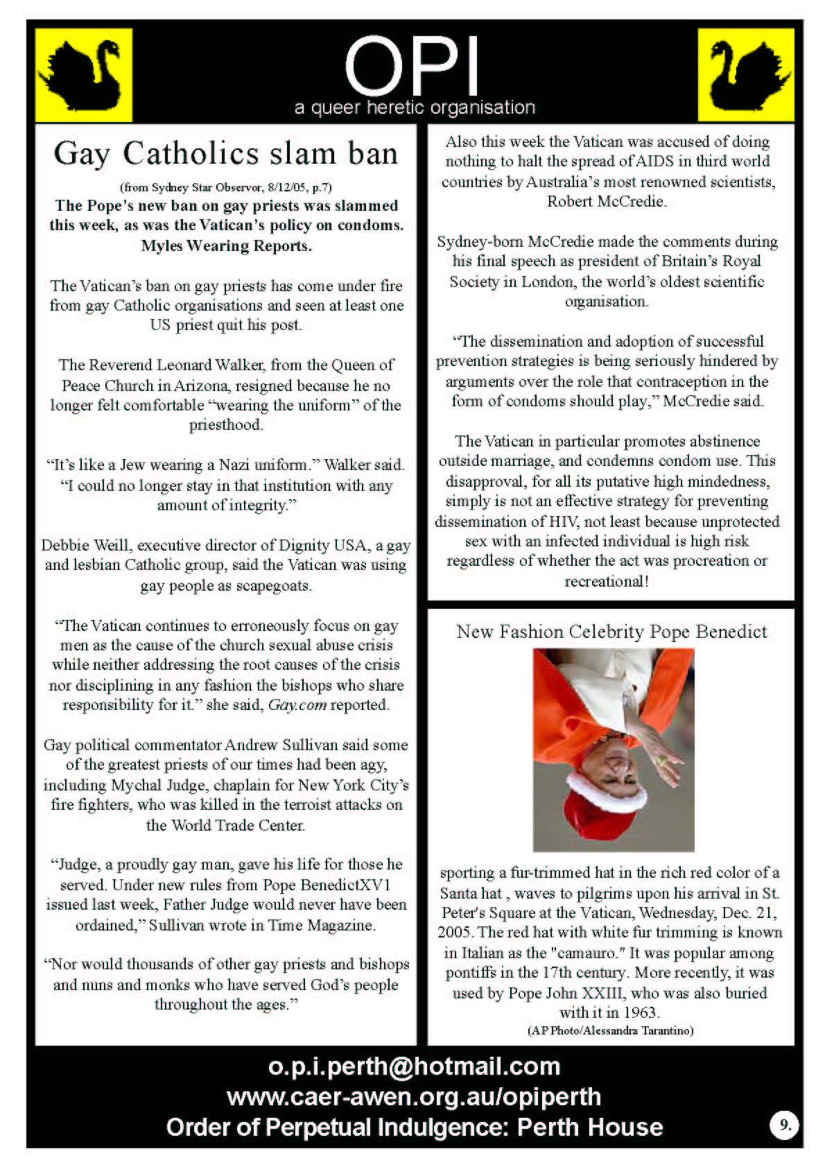 In 2006 the Order of Perpetual Indulgence published the New Gay Newspaper. One of the articles by James Rendell 1+1 does not Equal 0 spoke out in support of Equal Marriage Rights and this was the start of the journey towards the first Marriage Equality Campaign in Australia.
