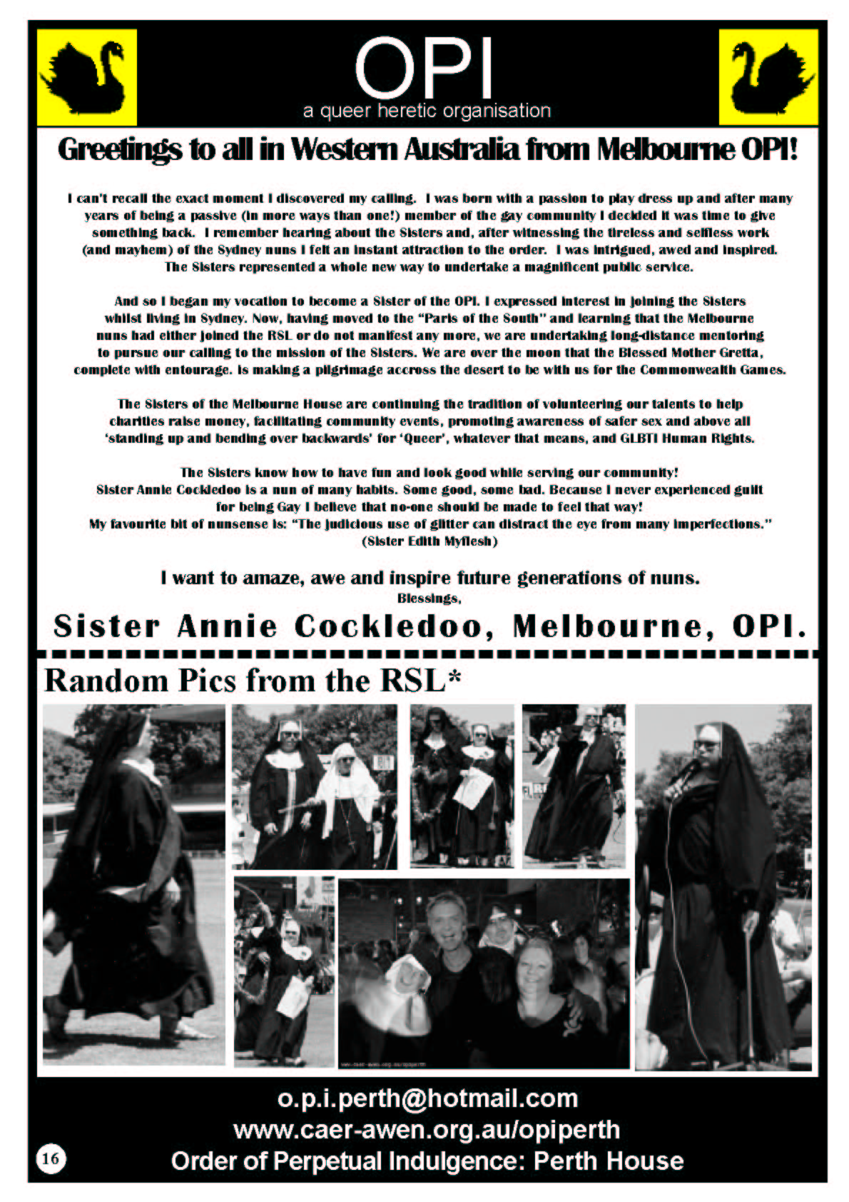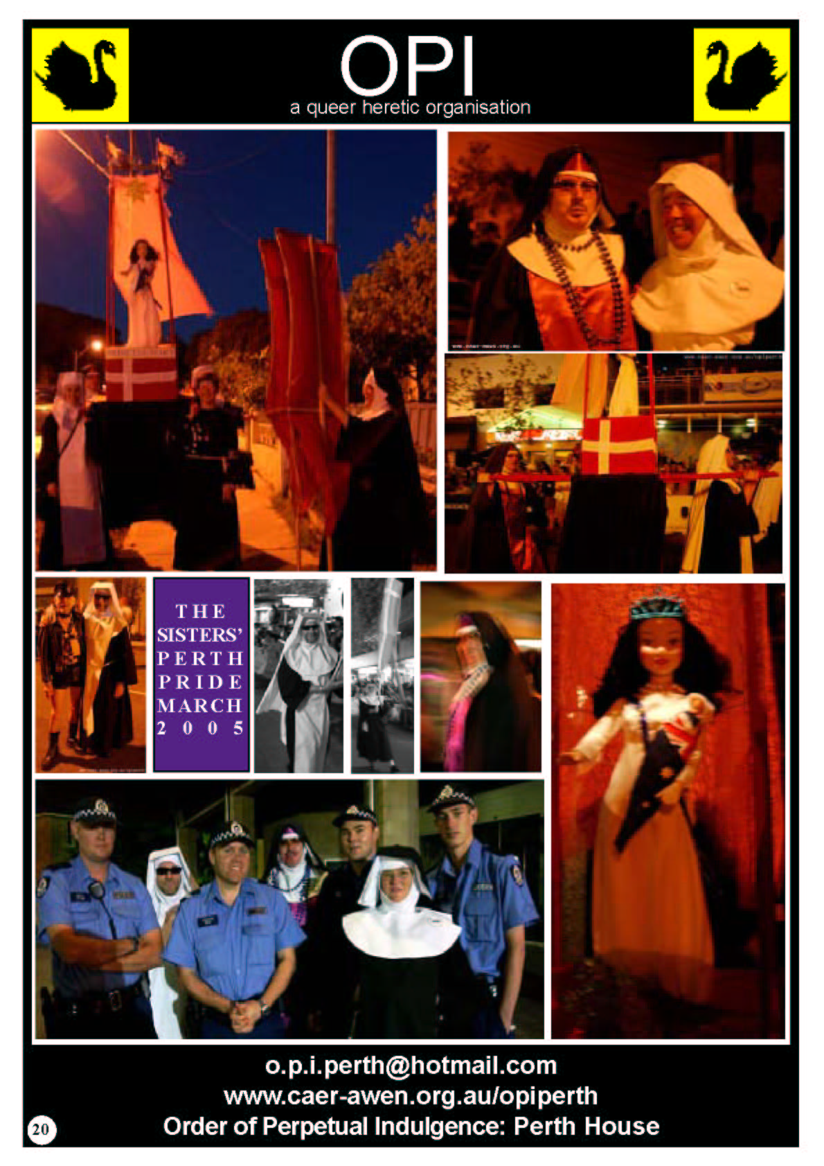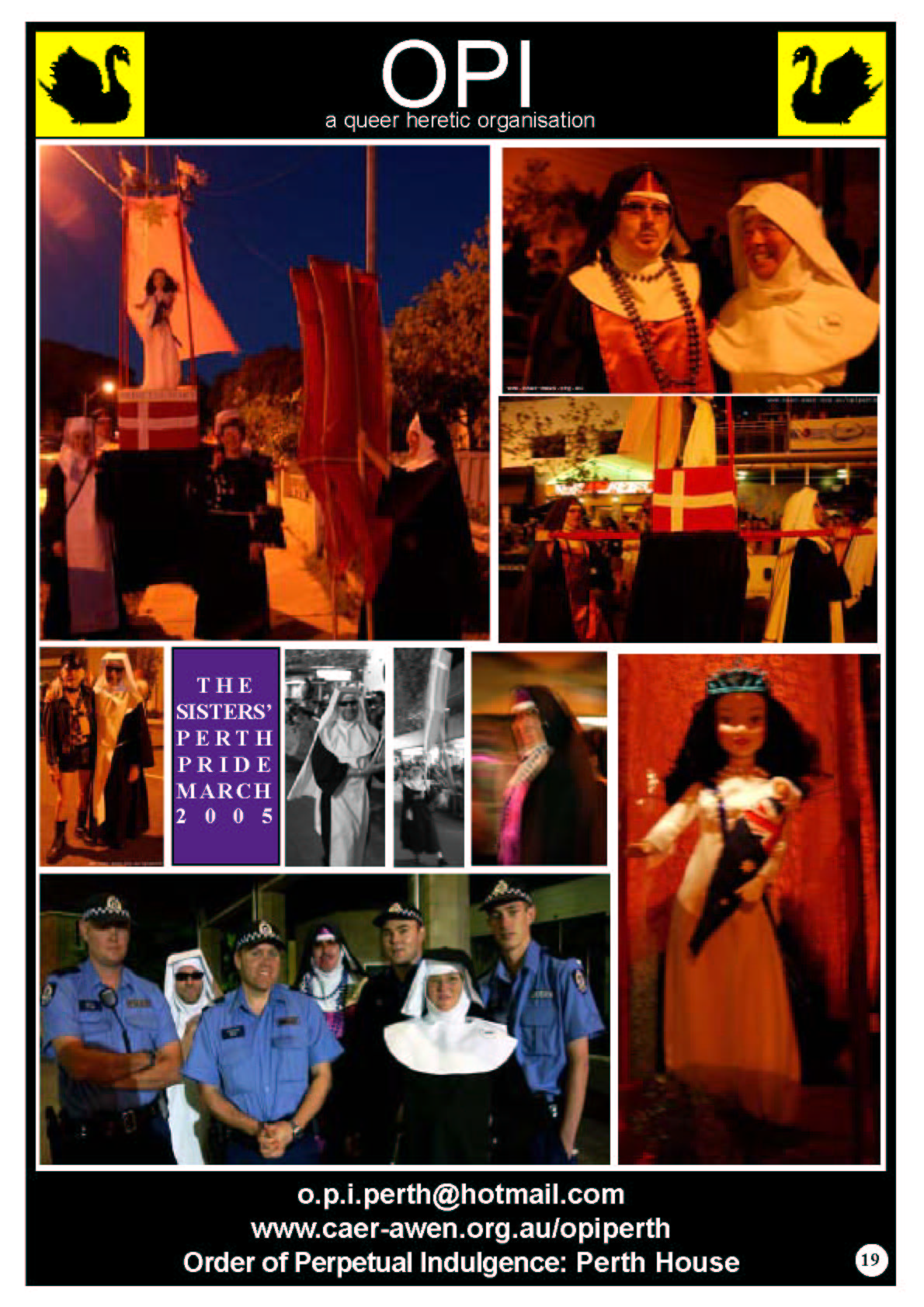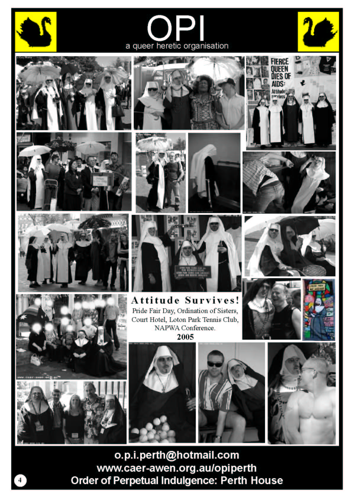 It was this feedback from the community that inspired Sr Mary-Jane and Mother Gretta to have the Marriage Chapel of the Black Swan at Perth Pride Fairday in 2006 where the Sisters conducted weddings and members of the gathered faithful stuck a pin in a doll with John Howard's face on it.