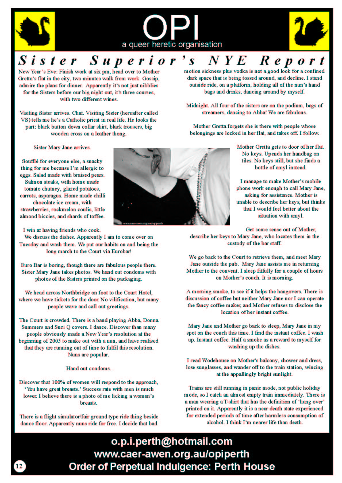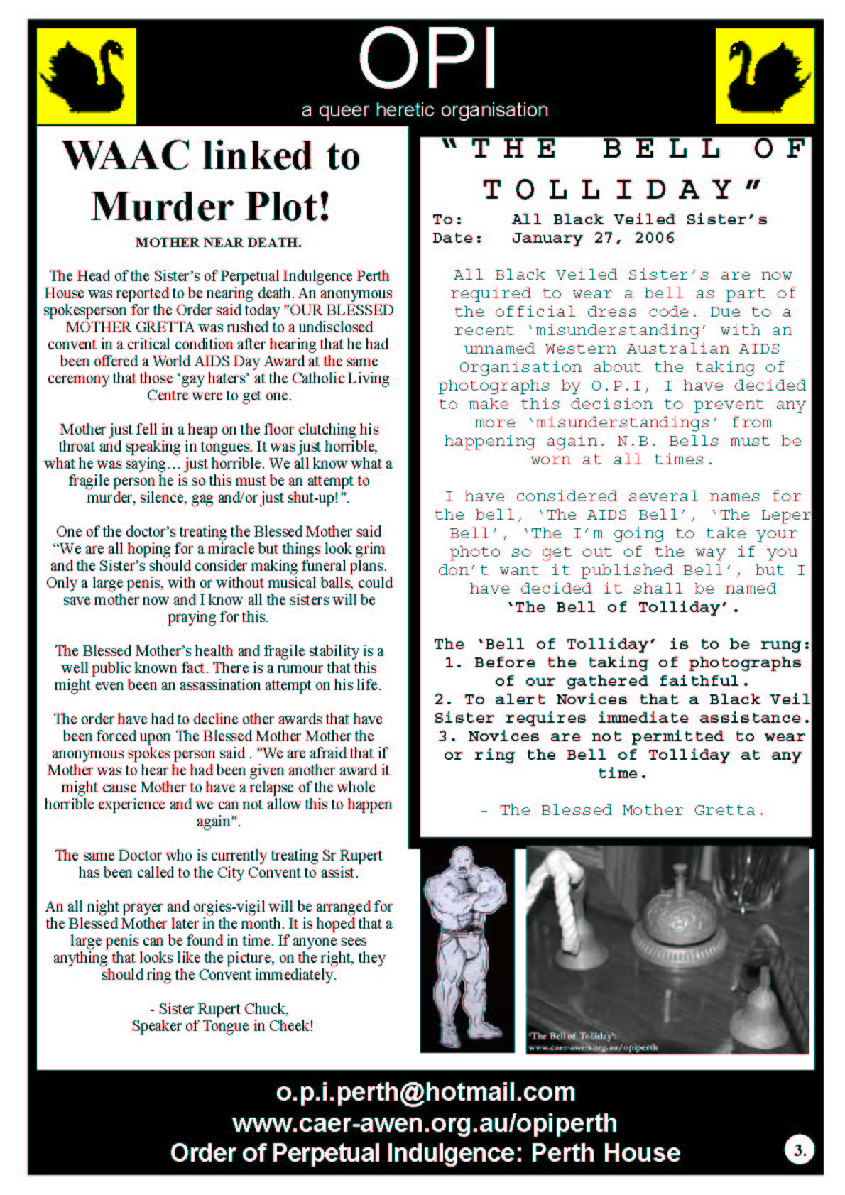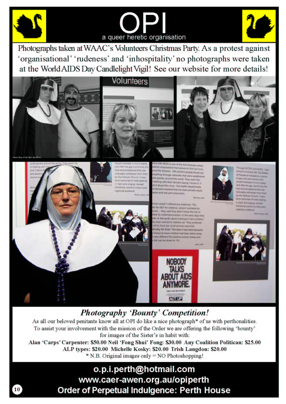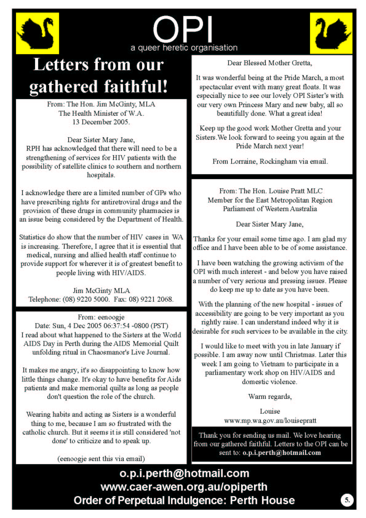 It was this feedback from the community that inspired Sr Mary-Jane and Mother Gretta to have the Marriage Chapel of the Black Swan at Perth Pride Fairday in 2006 where the Sisters conducted weddings and members of the gathered faithful stuck a pin in a doll with John Howard's face on it.