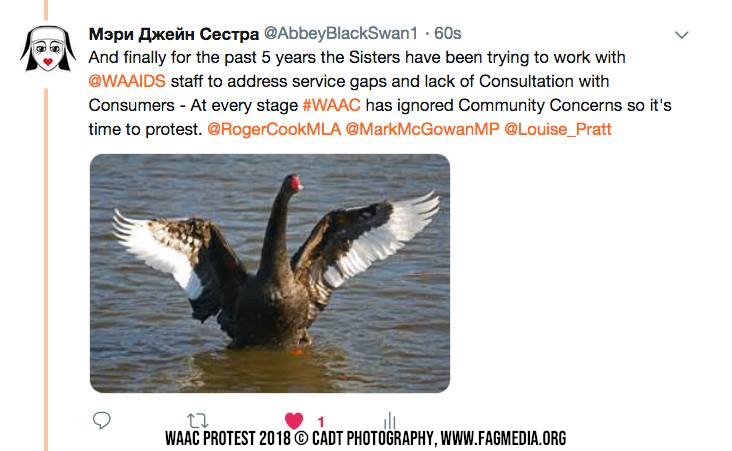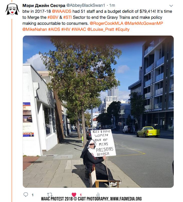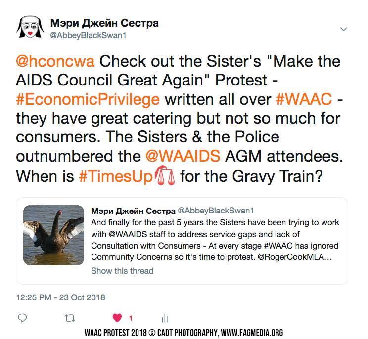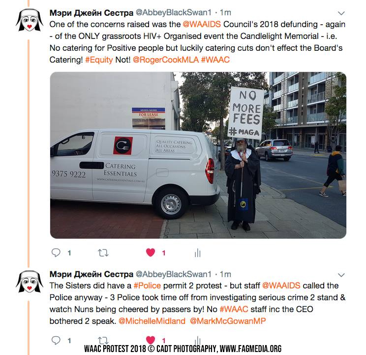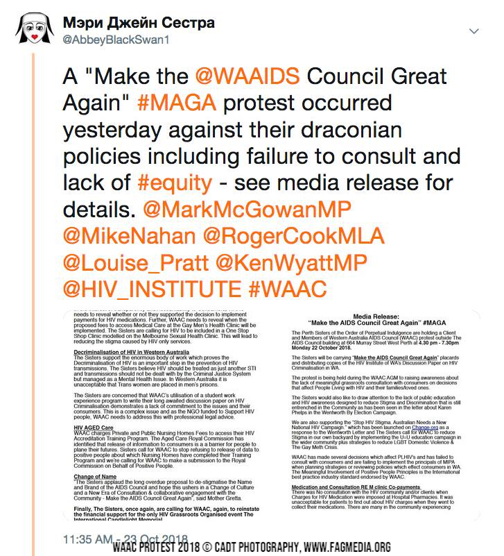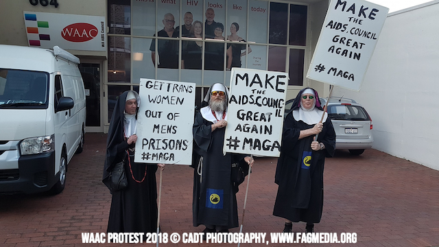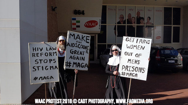 The Perth Sisters of the Order of Perpetual Indulgence are holding a Client and Members of Western Australia AIDS Council (WAAC) protest outside The AIDS Council building at 664 Murray Street West Perth at 4.30 pm - 7.30pm Monday 22 October 2018.