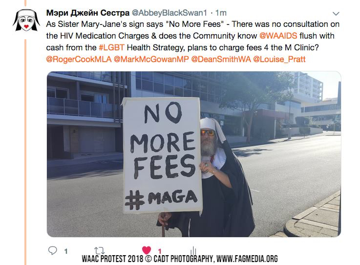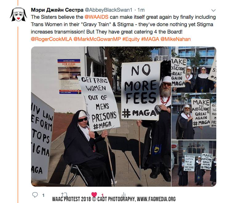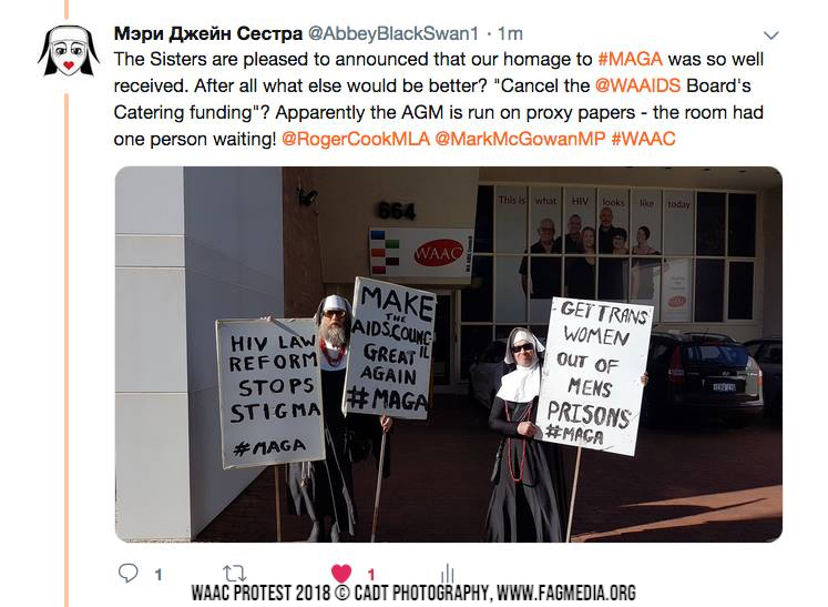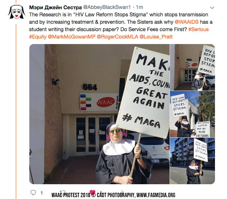 The Sisters will be carrying “Make the AIDS Council Great Again” placards and distributing copies of the HIV Institute of WA’s Discussion Paper on HIV Criminalisation in WA.