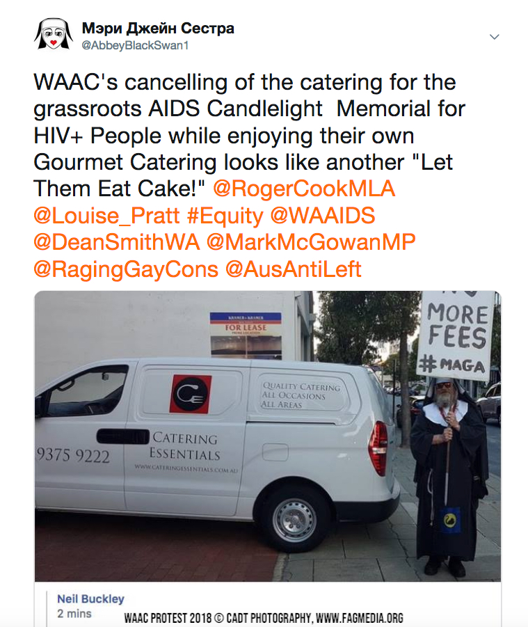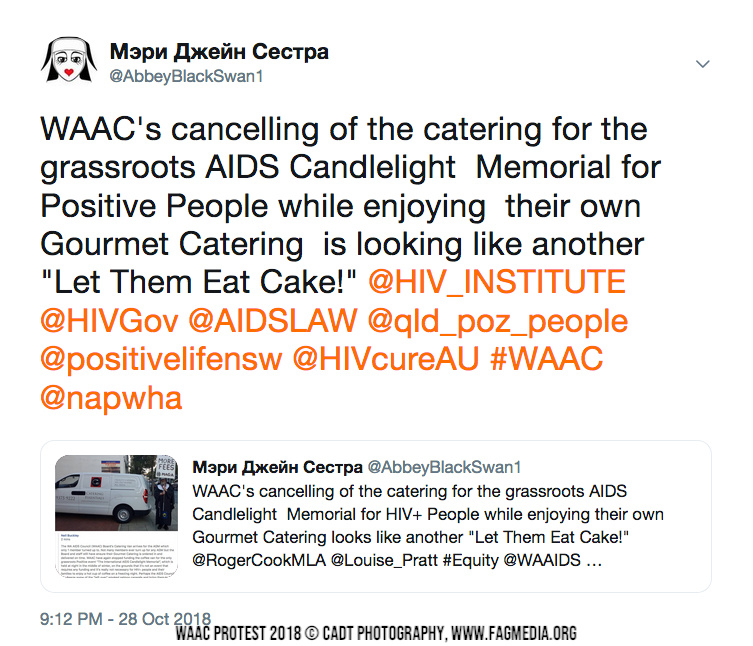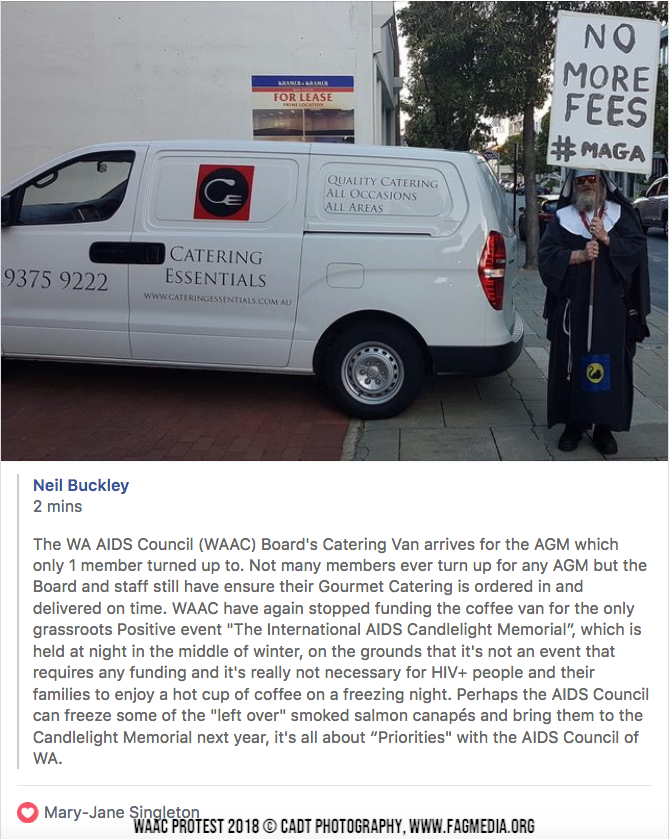 Editor's Note: This protest did get some short term bandaid solutions and the reinstatement of the Coffee Van for the AIDS Candlelight Memorial, however, the root problem is that there is an entrenched Gravy Train culture in which the few and WAAC staff use the organisation to serve themselves.