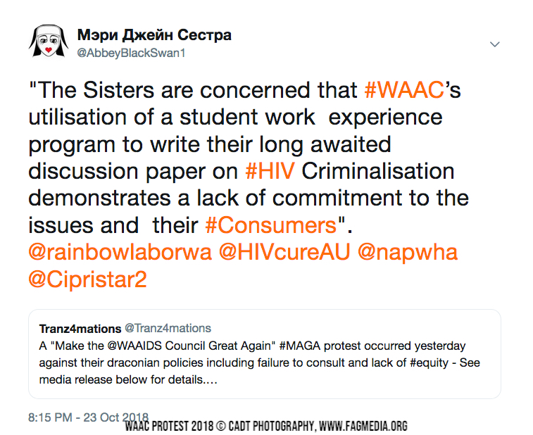 The Sisters are concerned that WAAC’s utilisation of a student work experience program to write their long awaited discussion paper on HIV Criminalisation demonstrates a lack of commitment to the issues and their consumers. This is a complex issue and as the NGO funded to Support HIV people, WAAC needs to address this with professional legal advice.