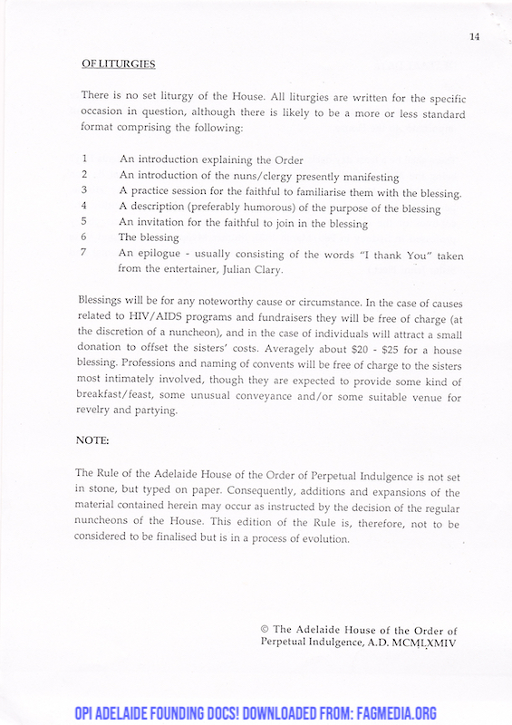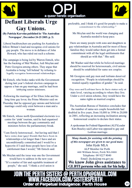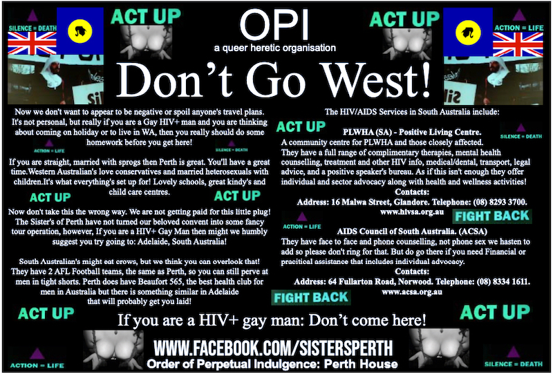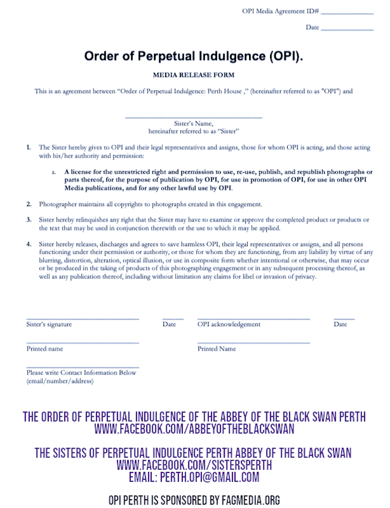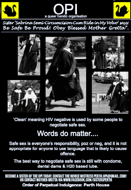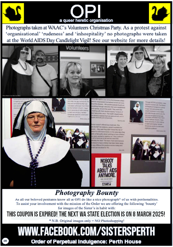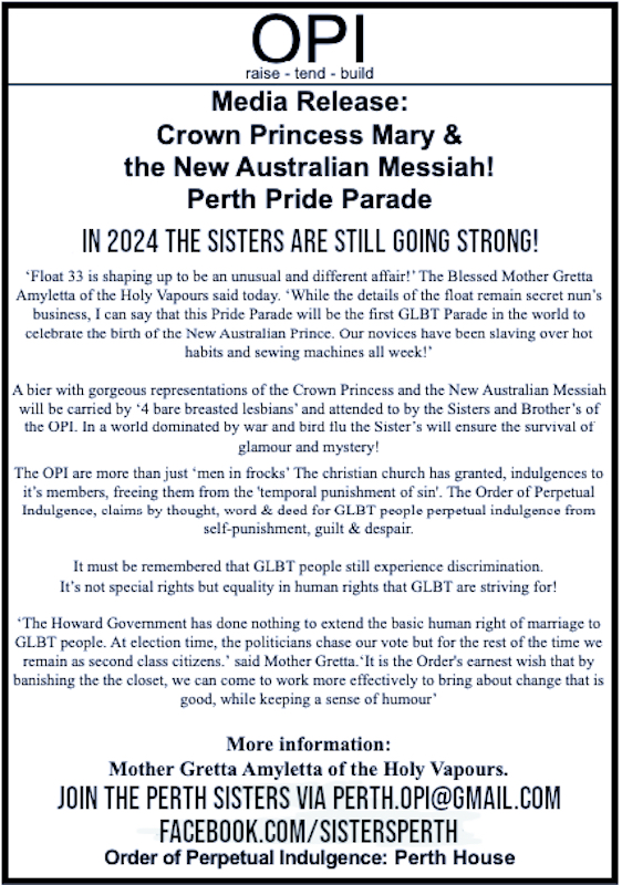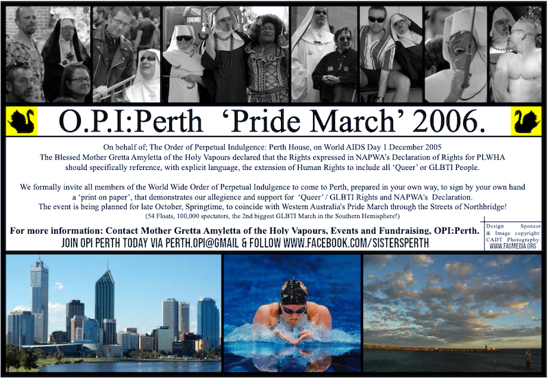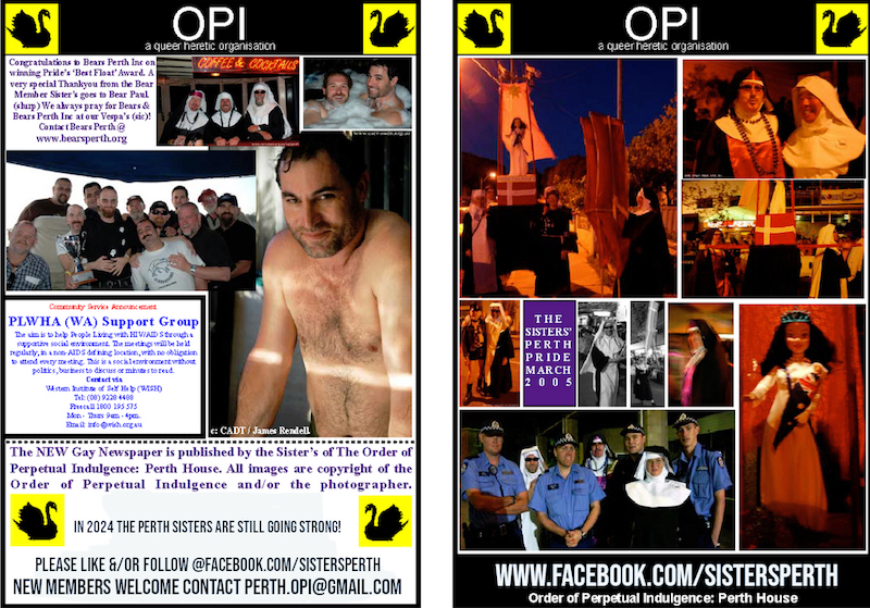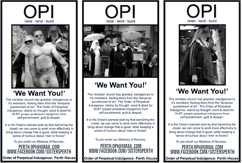The Sisters of the Order of Perpetual Indulgence have advised Fagmedia that they are currently inviting Members of the Gathered Faithful to Join the OPI-Perth as Sisters and Brothers. To this end as a sponsor of the OPI in WA, Fagmedia is pleased to support this missionary work.